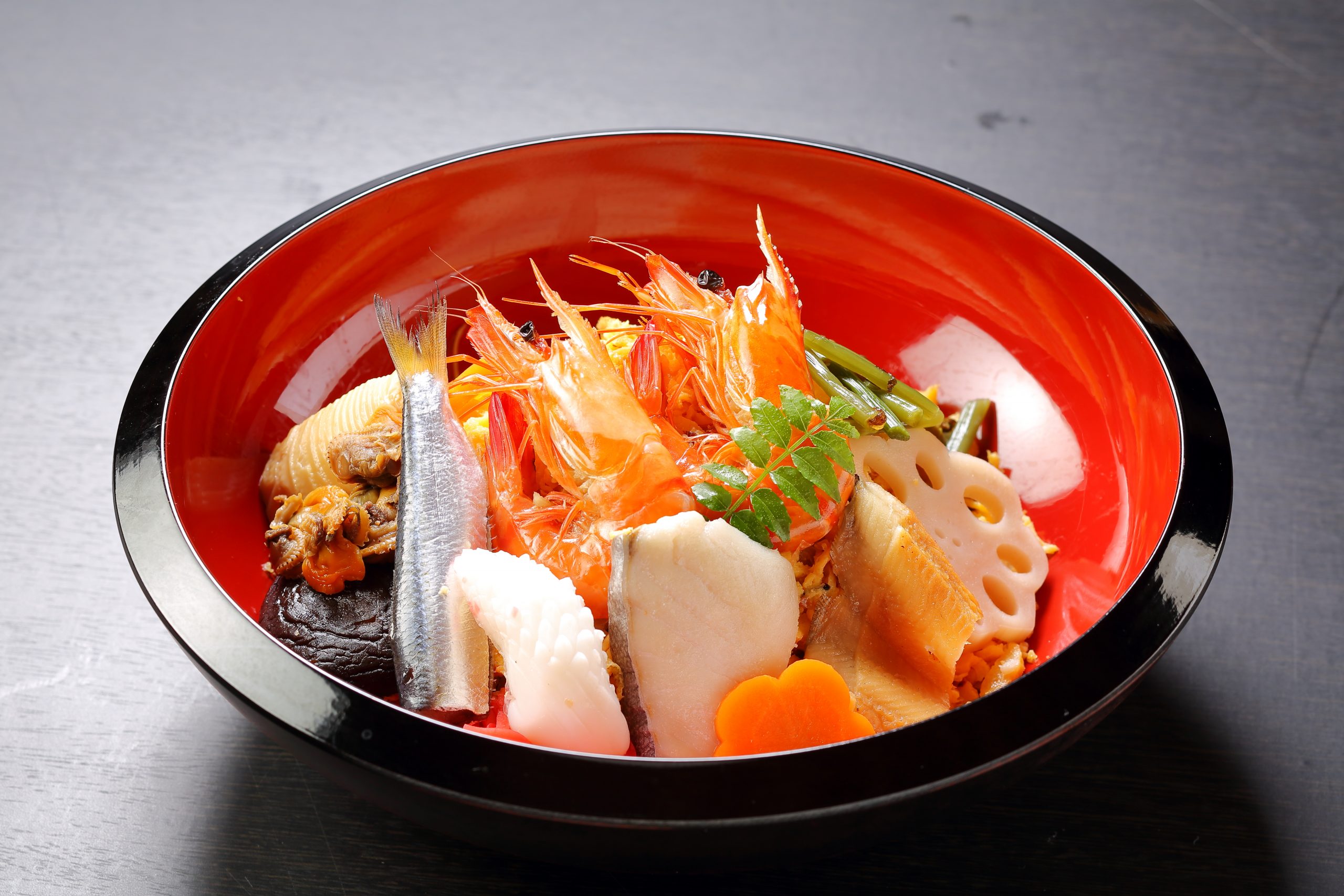 Okayama’s bara-zushi (Scattered Sushi) is a vibrant and festive dish topped with a bounty of seafood and mountain vegetables from the Setouchi region. The ingredients vary from family to family, reflecting the local life and traditions of the area.