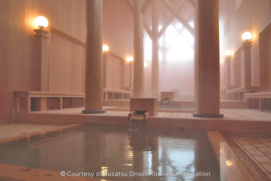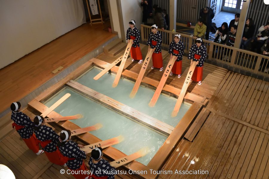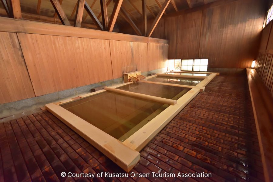 The resort’s spring water is among Japan’s most acidic, celebrated for its antibacterial properties and ability to soothe various physical ailments since ancient times. To fully enjoy Kusatsu Onsen’s therapeutic waters, start by gently rinsing your body to get acclimated. Then, relax and soak in the bath slowly, up to three times a day. Avoid rinsing afterward to let the minerals absorb, maximizing their benefits for your skin. Central to the town’s identity is the Yubatake, or “hot water field,” where steaming, mineral-rich water flows visibly through large pinewood tubs in the town square. Kusatsu’s source water is extremely hot, making it impossible to bathe in it as is. In order to lower the water to a suitable bathing temperature, the traditional practice of yumomi, in which the water is stirred with large wooden boards, is still performed today as a popular demonstration accompanied by the local folk song known as the Kusatsu Bushi.